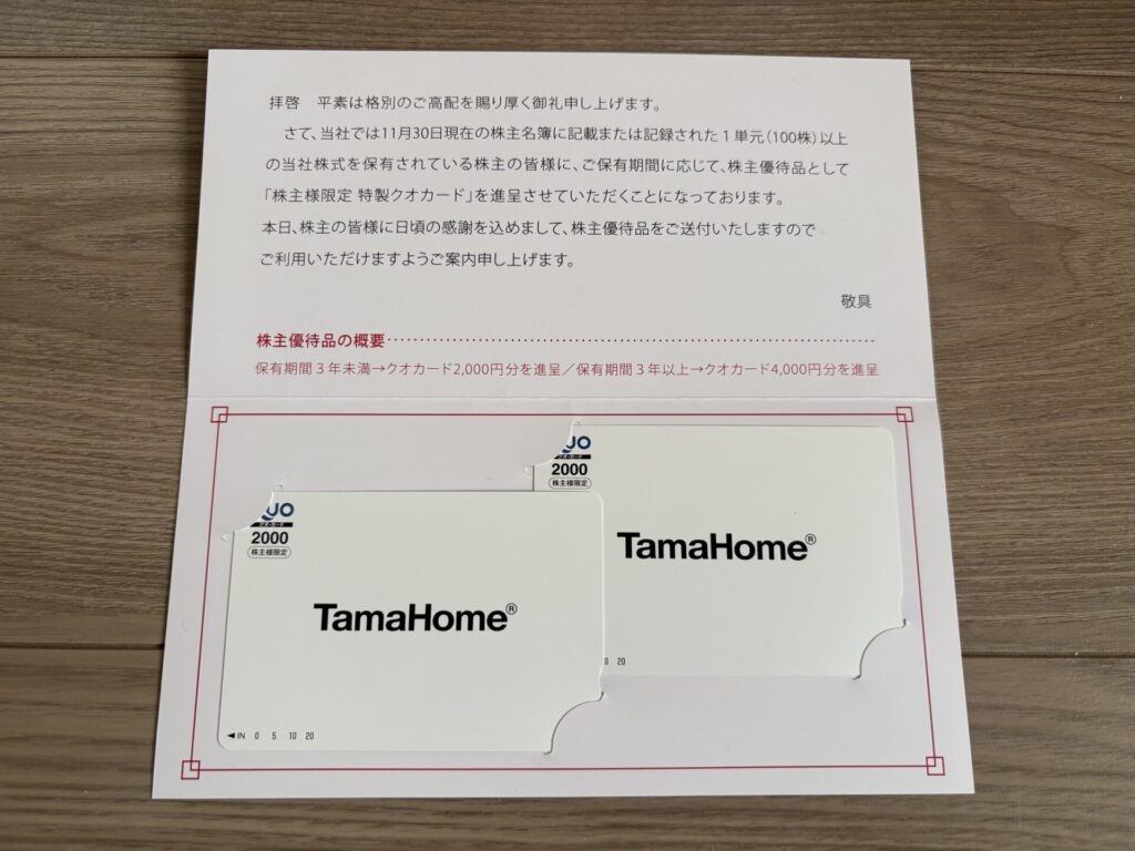 2026年1月29日に、タマホームから株主優待が届きましたので、株主優待の内容を紹介します。