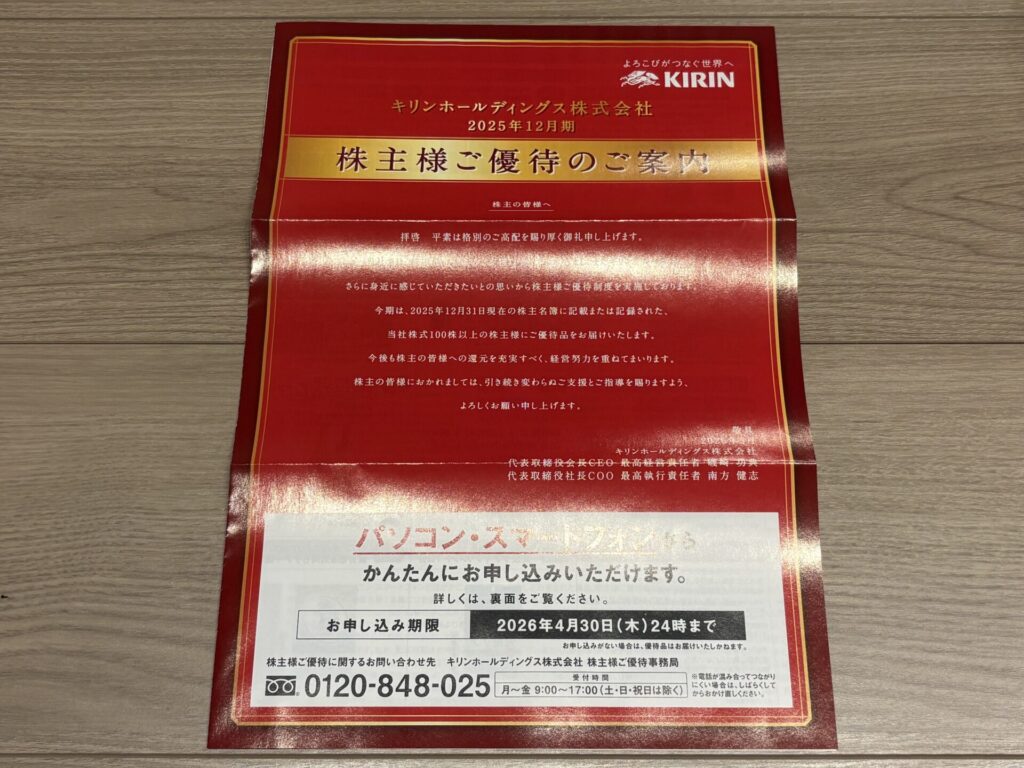 キリンホールディングス(2503)の株主優待の案内の到着!【2025年12月】