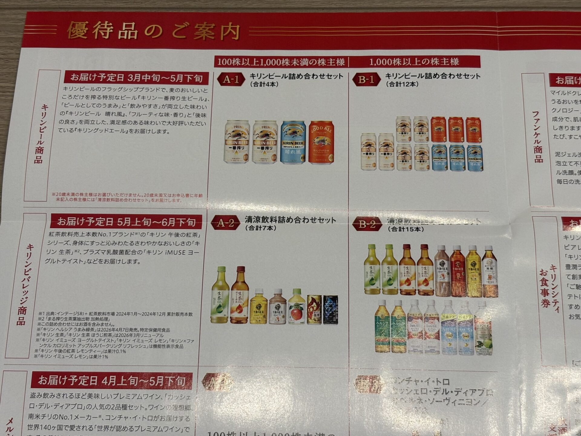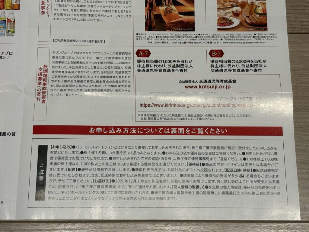 キリンホールディングスから以下の写真のような株主優待の案内が届きました。