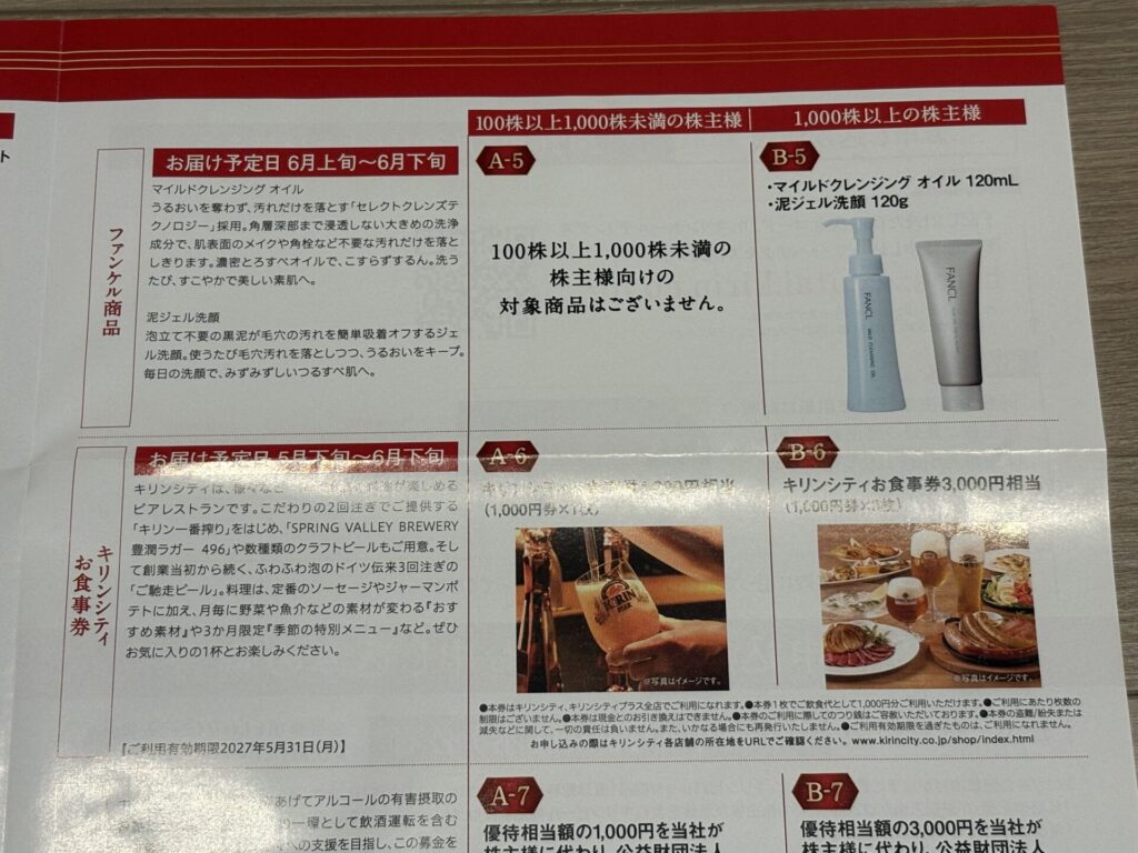 また、メルシャン商品とファンケル商品は1000株以上からとなります。