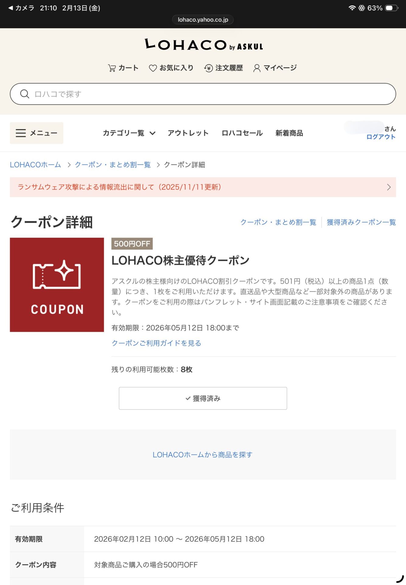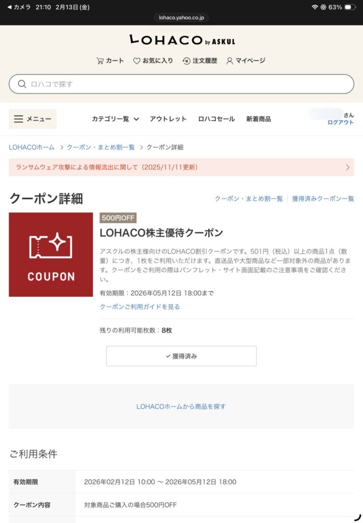 更に2025年5月期の株主優待で頂いた割引クーポンが、ランサムウェア感染によるシステム障害で利用できなかったため、そちらの分の割引クーポンも加わり、合計で4,000円分となりました。