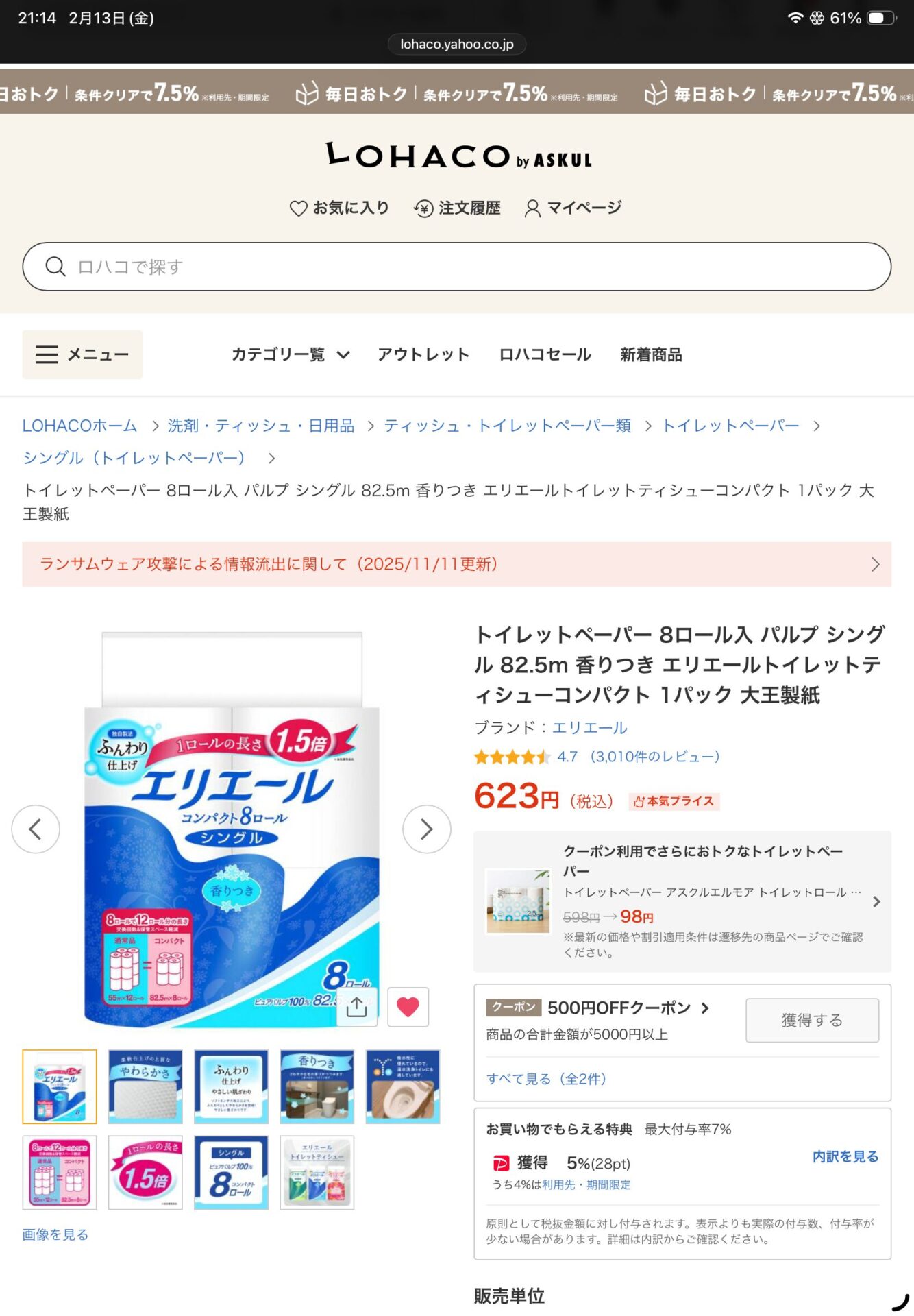 例えば、下のトイレットペーパーは、税込623円のところ、株主優待クーポンの利用で123円で購入できます。