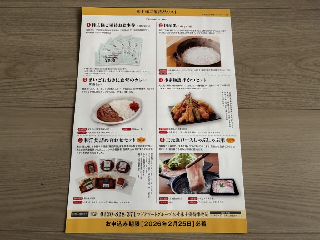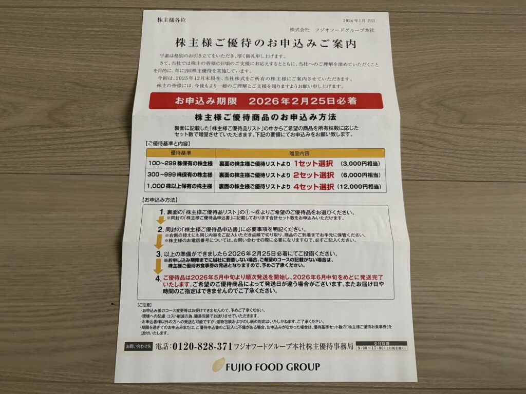 2026年2月2日に、フジオフードグループ本社から株主優待の案内が届きましたので、株主優待の内容を紹介します。