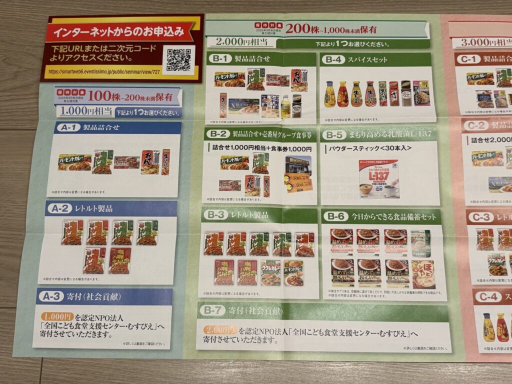ハウス食品グループ本社の株主優待は、製品詰合せ、レトルト製品等自社グループ製品から1点選ぶというものです。