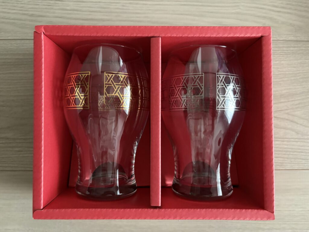 グラスは、トマトジュース専用に設計したオリジナルグラスとなっており、カゴメの社名の由来にもなっている籠の目模様が描かれています。