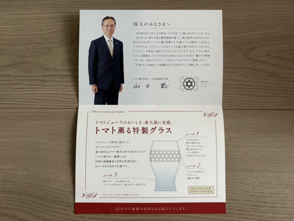トマト薫る特製グラス 2個のセットと、株主10年記念パッケージの飲料2種類です。