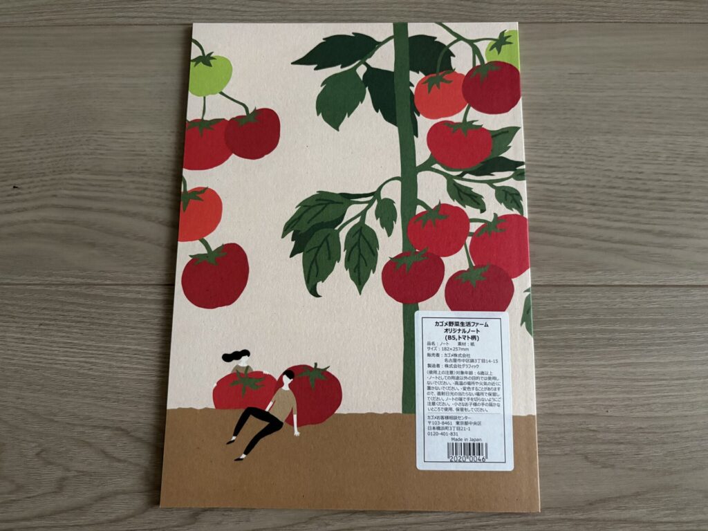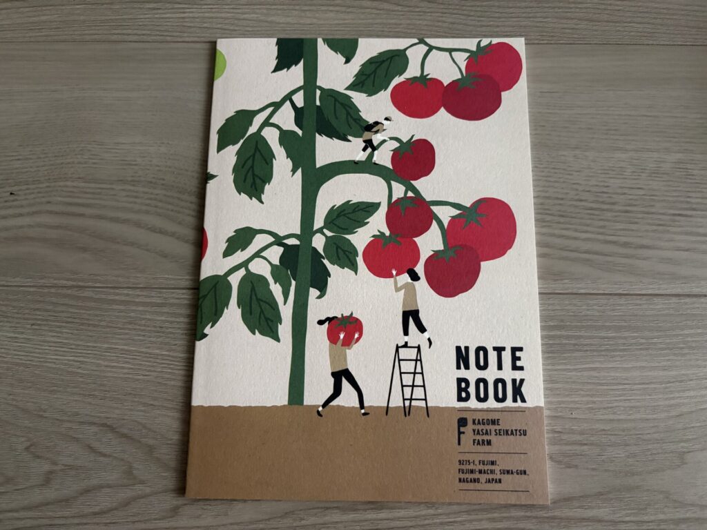 カゴメ野菜生活ファーム オリジナルノートは3種類あり、今回はトマト柄を頂きました。