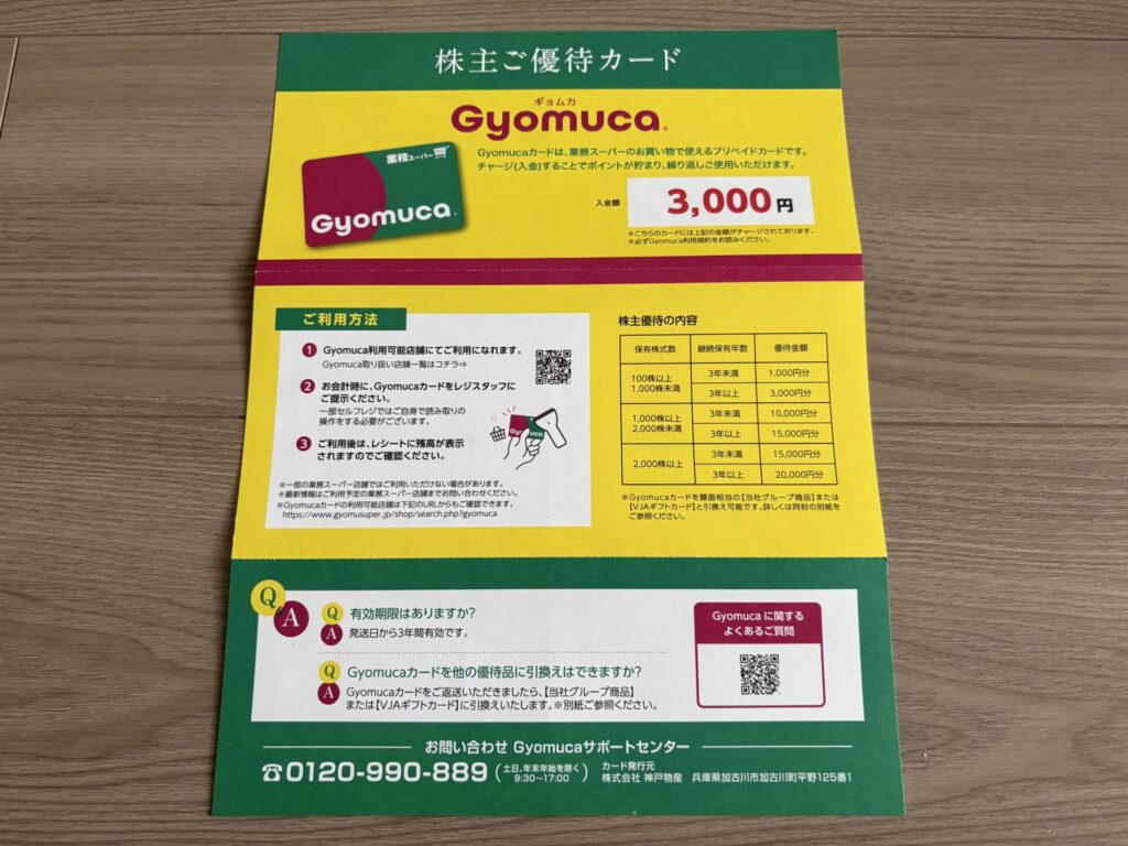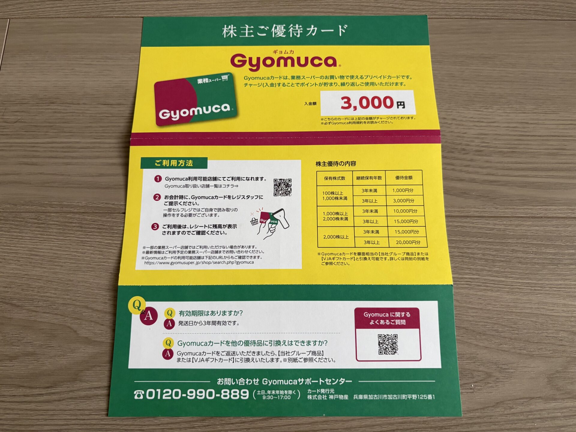 10月の権利確定で100株を3年以上継続保有していたので、 Gyomucaカード 3,000円分を頂きました!