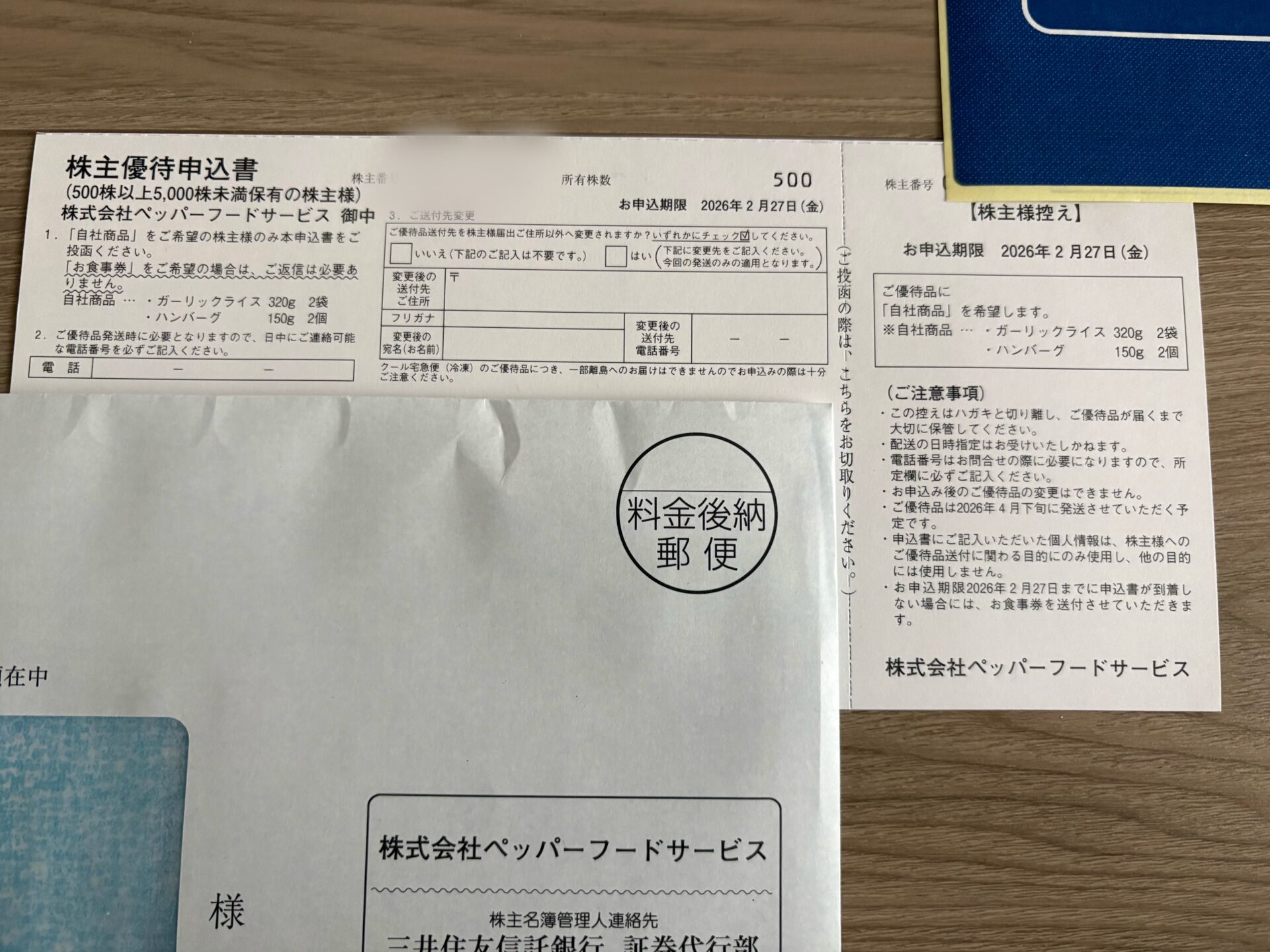 ペッパーフードサービスから、以下の写真のような株主優待申込書が届きました。