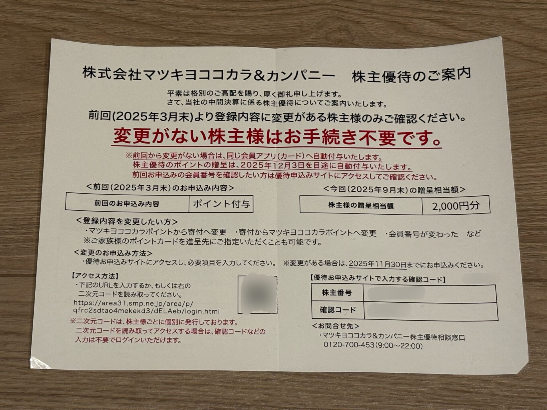 2025年11月6日に、マツキヨココカラ&カンパニーから株主優待が届きましたので、株主優待の内容を紹介します。