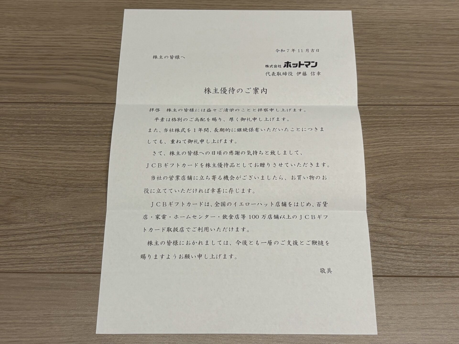 2025年11月18日に、ホットマンから株主優待が届きましたので、株主優待の内容を紹介します。