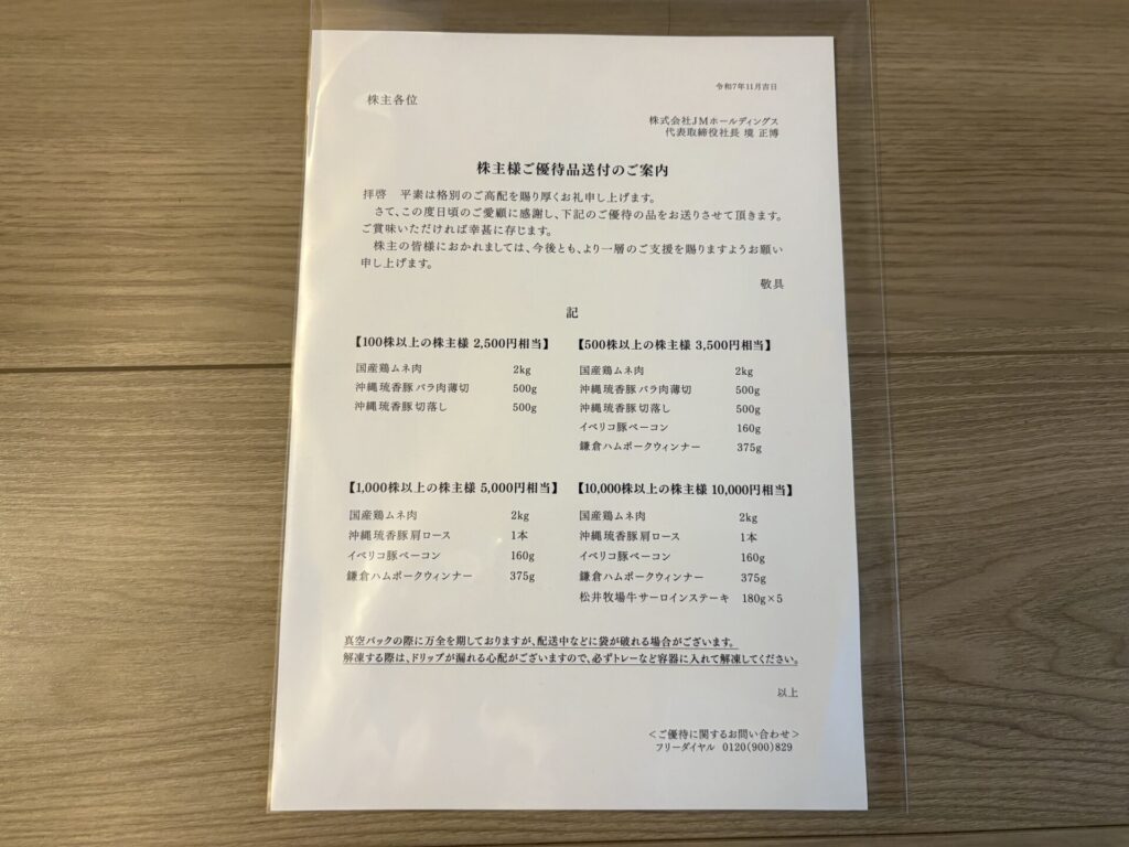2026年11月26日に、JMホールディングスから株主優待が届きましたので、株主優待の内容を紹介します。