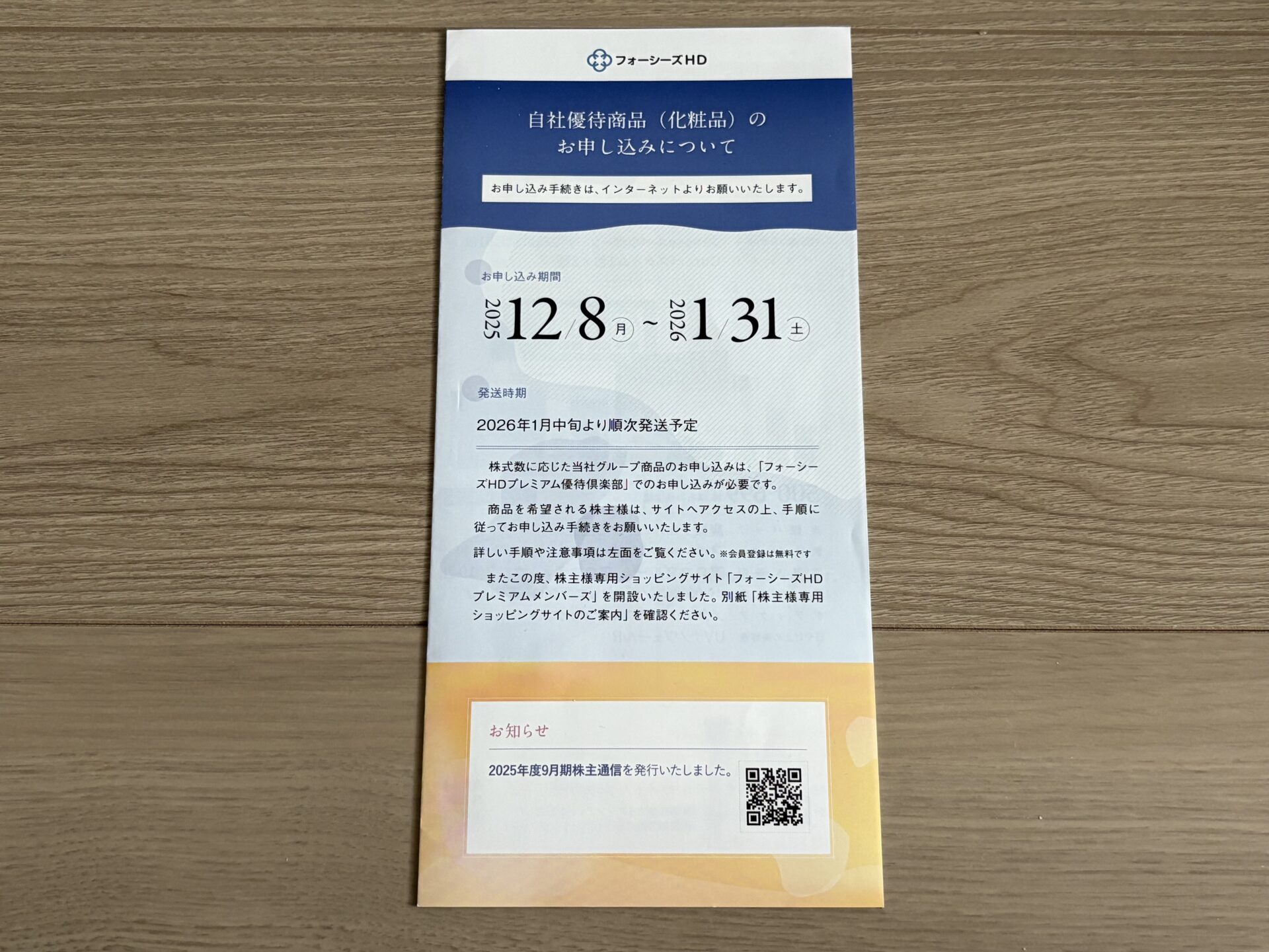 2025年12月10日に、フォーシーズHDから株主優待の案内が届きましたので、株主優待の内容を紹介します。