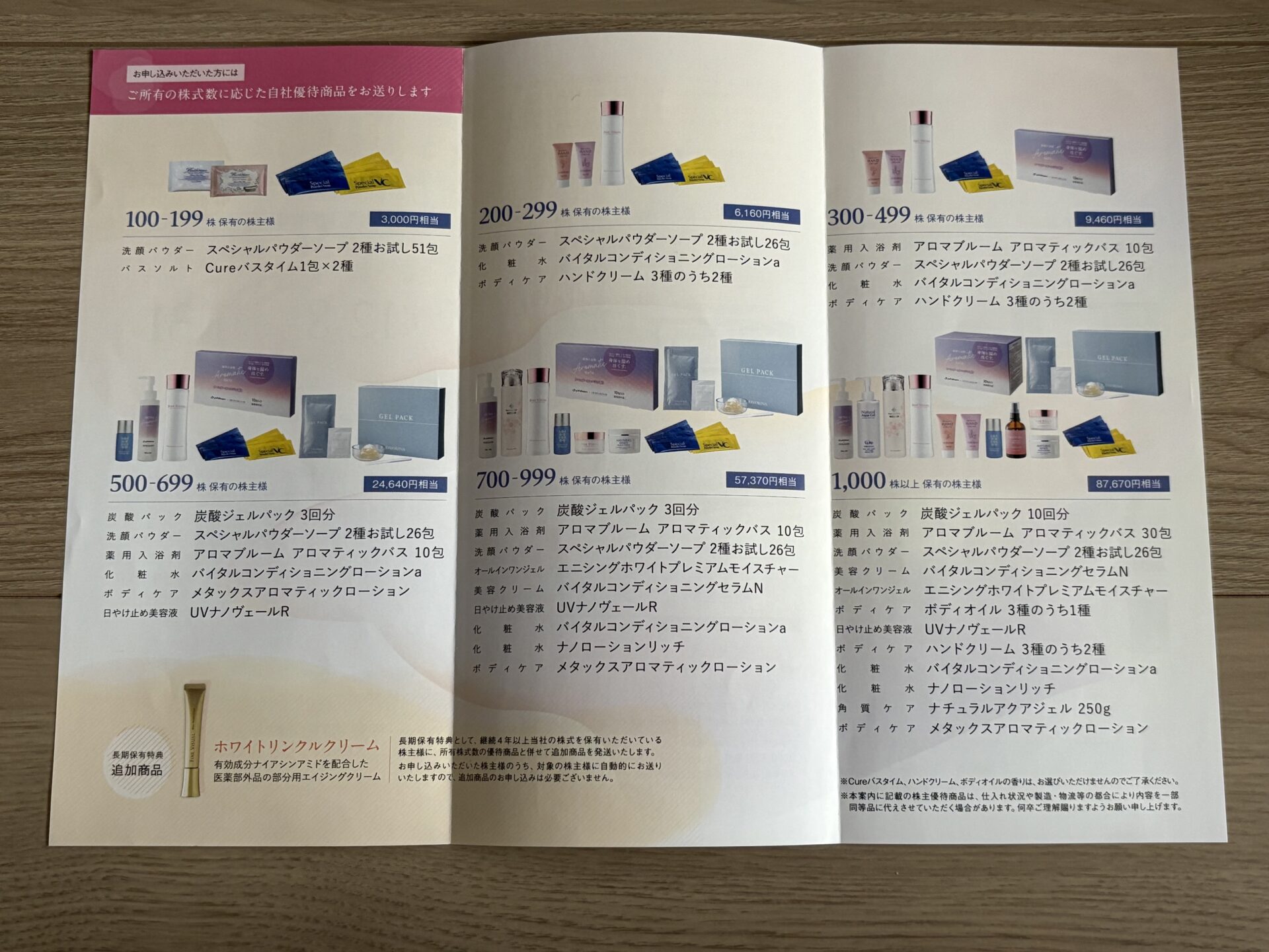 保有株数に応じた化粧品の詳細は以下の写真の通りです。