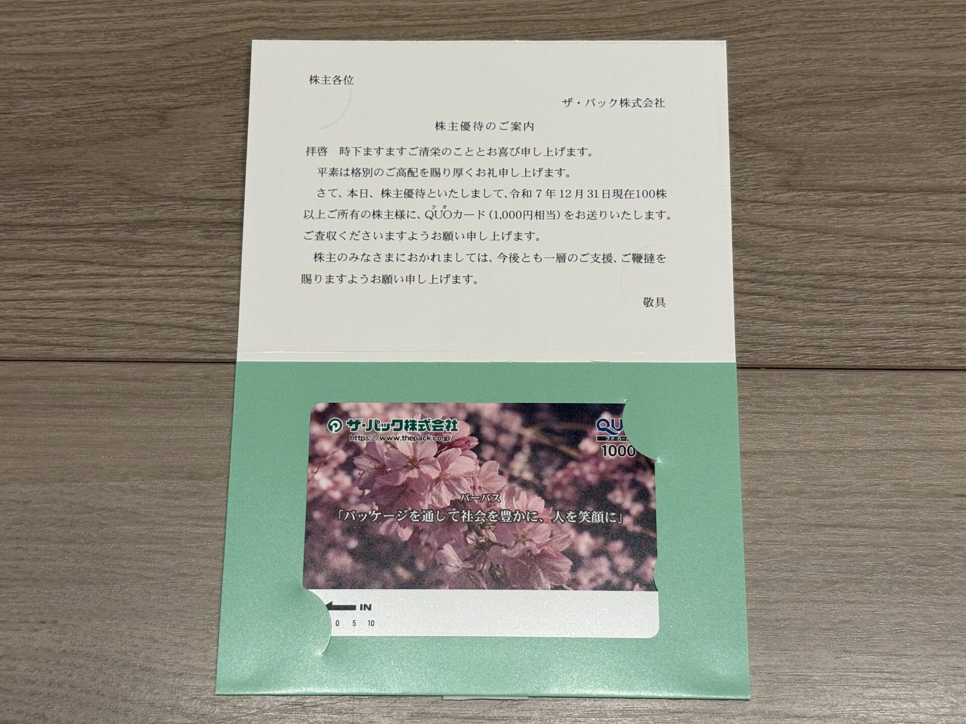 ザ・パックの株主優待は、オリジナルクオカードです。
