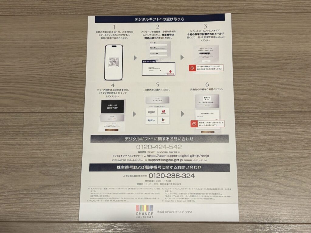デジタルギフトの受け取り方は、案内の裏面に記載がある通りです。