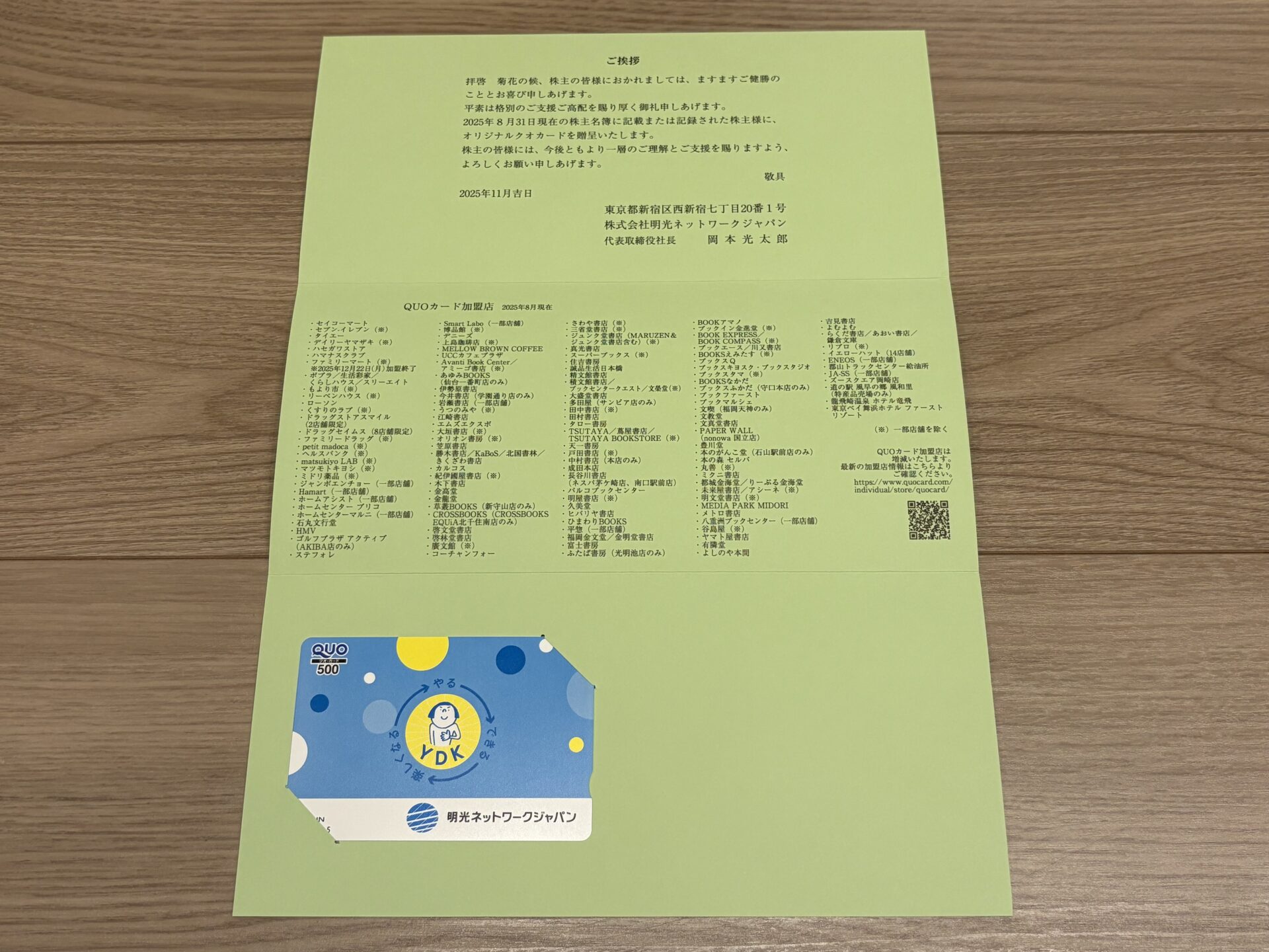 明光ネットワークジャパンの株主優待は、オリジナルクオカードです。