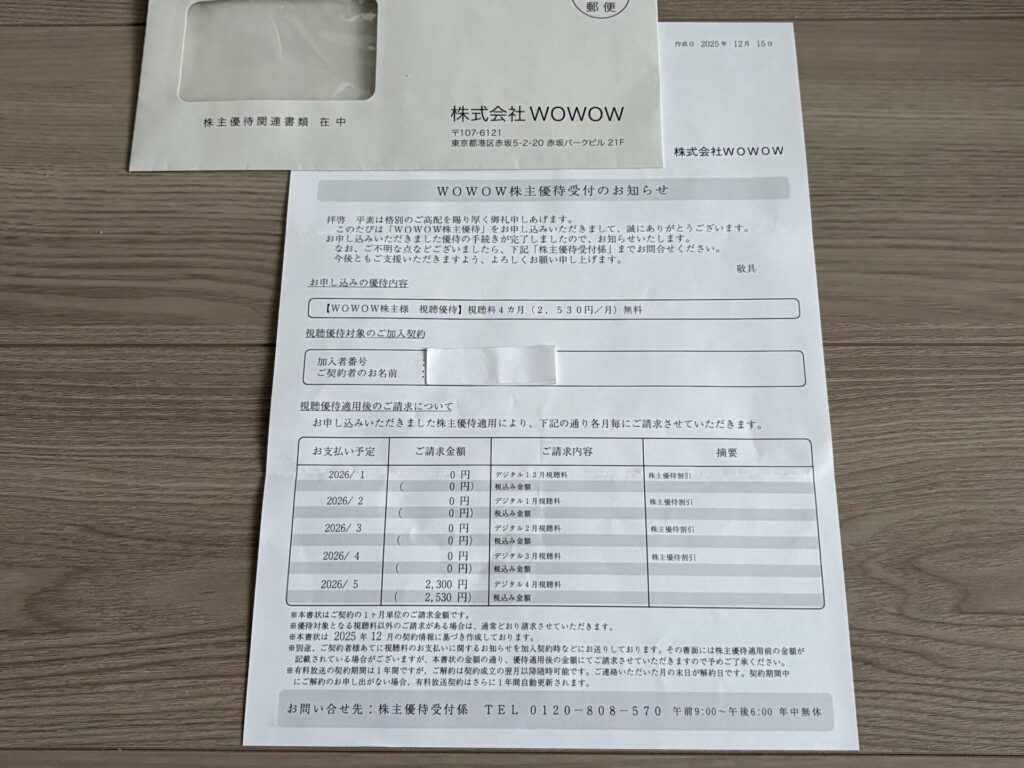 2025年12月17日に、WOWOWから株主優待が届きましたので、株主優待の内容を紹介します。