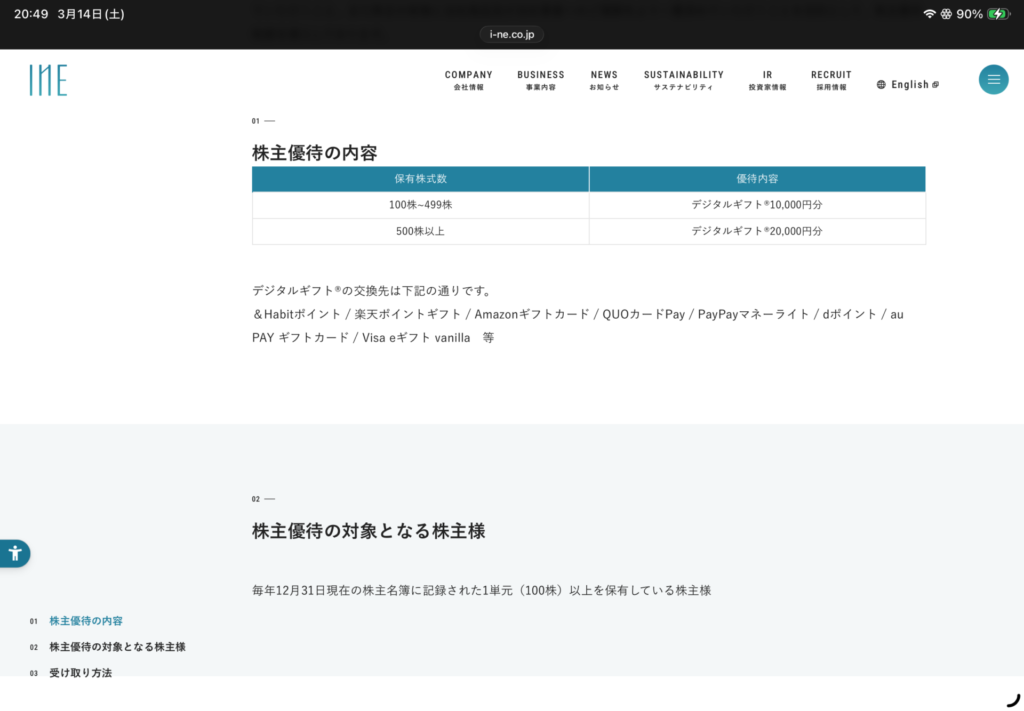 I-neの株主優待は、デジタルギフトです。