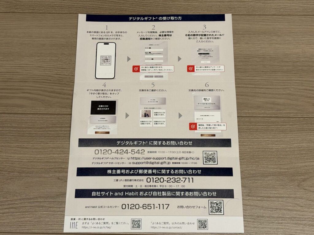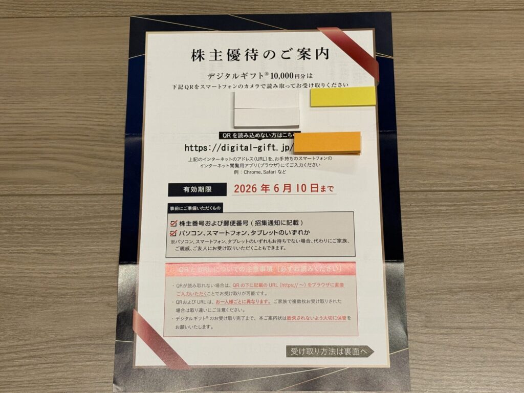 デジタルギフトの受け取り方は、案内の裏面に記載がある通りです。