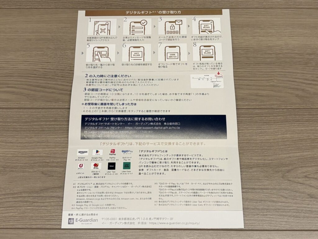 イー・ガーディアンの株主優待は、クオカードからデジタルギフトに変更になりましたが、dポイントなどのサービスを選べる様になって利便性がよくなっています。