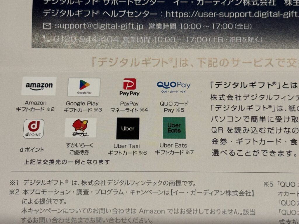 デジタルギフトは、Amazonギフトカード、PayPayマネーライト、クオ・カード ペイ、dポイントなどに交換できます。
