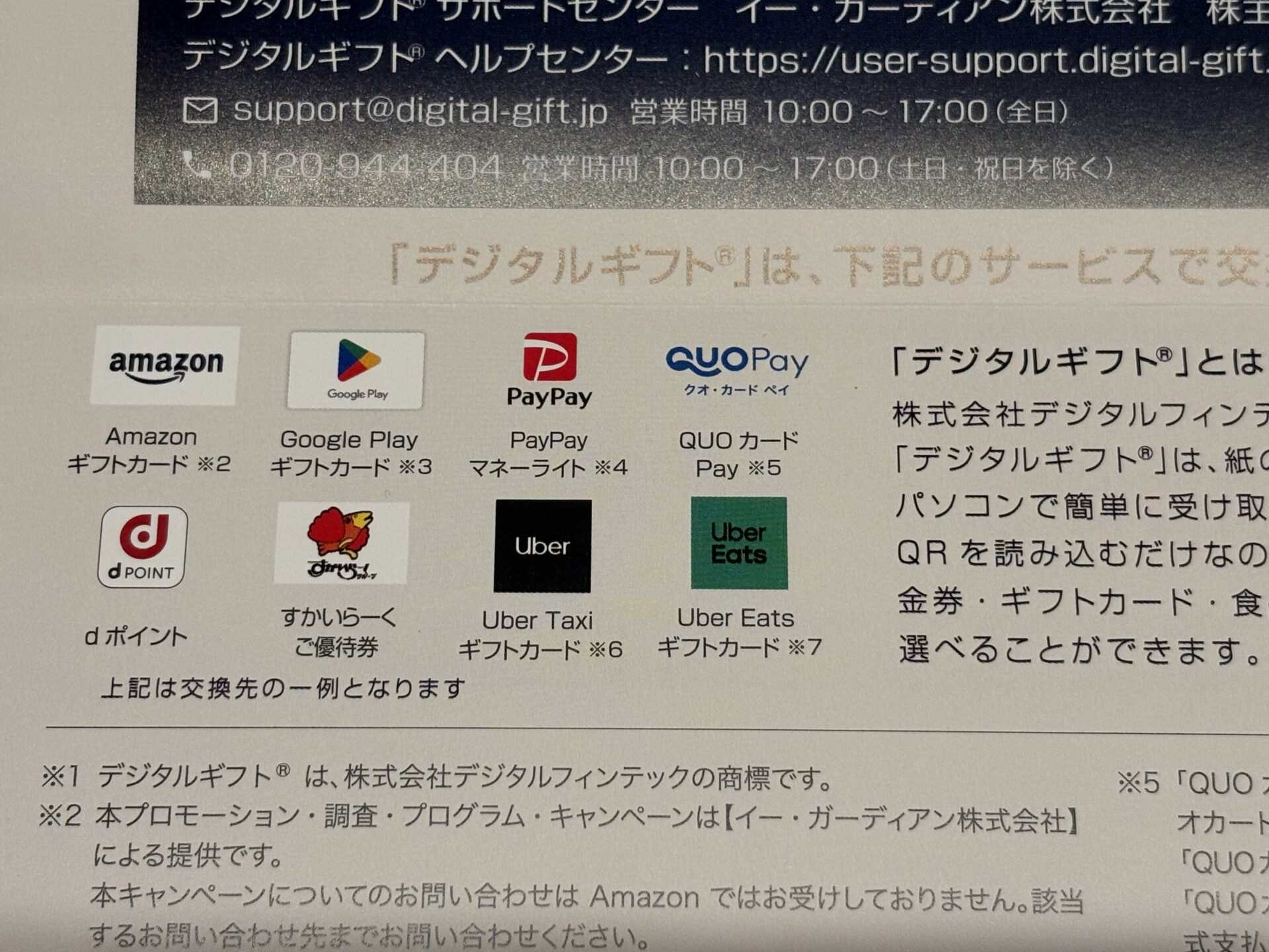 デジタルギフトの受け取り方は、案内の裏面に記載がある通りです。