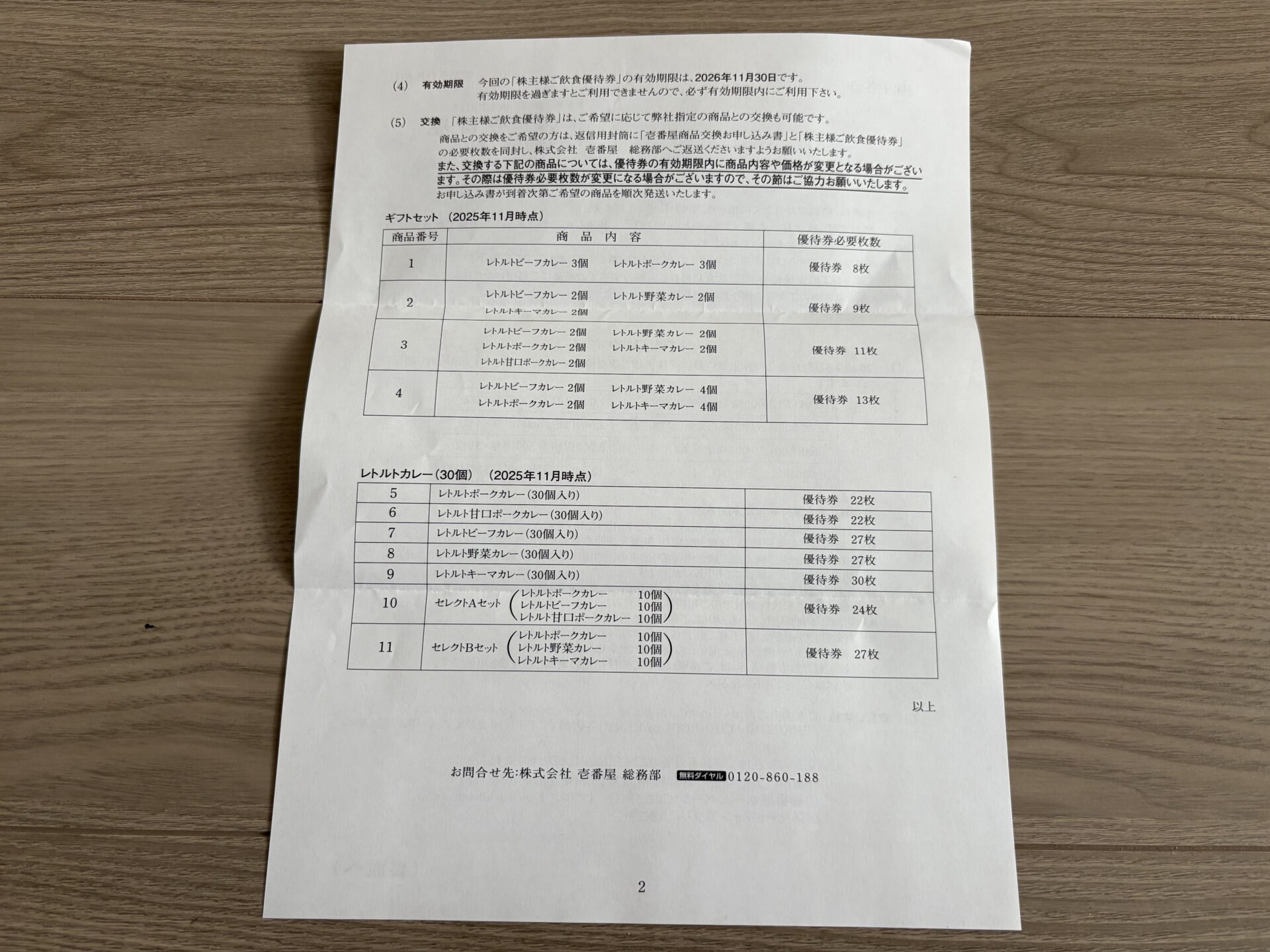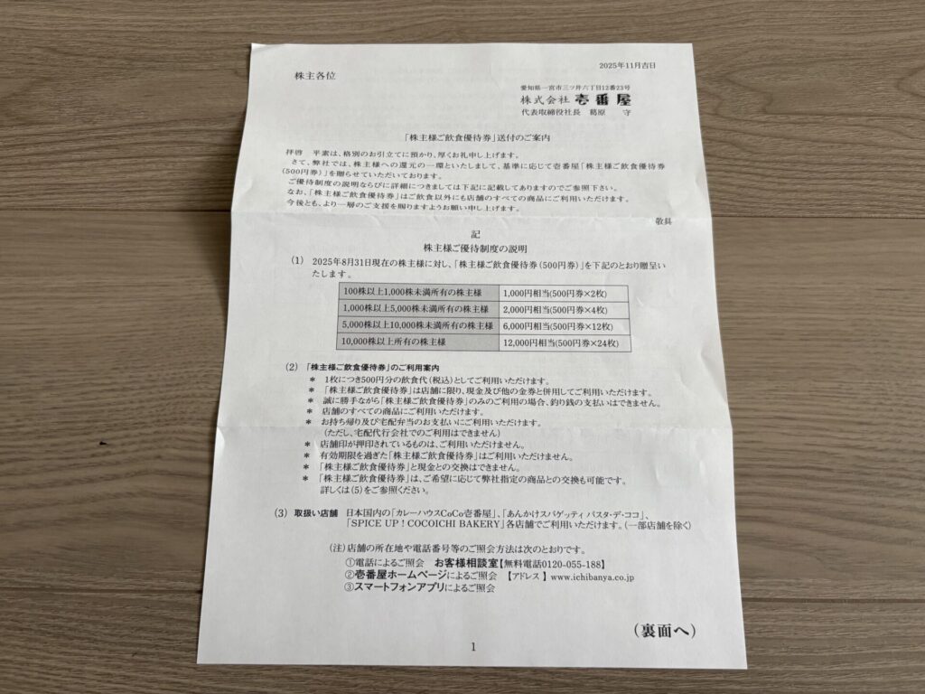 2025年11月18日に壱番屋から株主優待が届きましたので、株主優待の内容を紹介します。