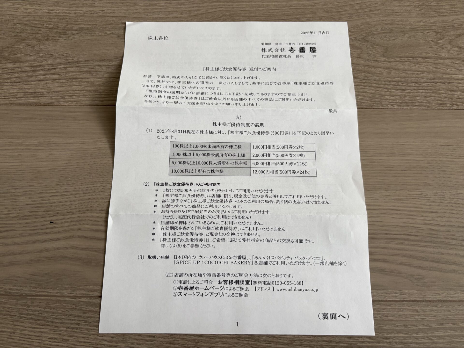 壱番屋の株主優待は、株主様ご飲食優待券です。