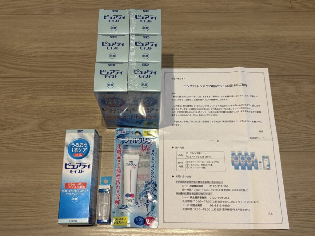 シードの株主優待では、毎回コンタクトレンズケア用品セットを選んでおり、重宝しています。