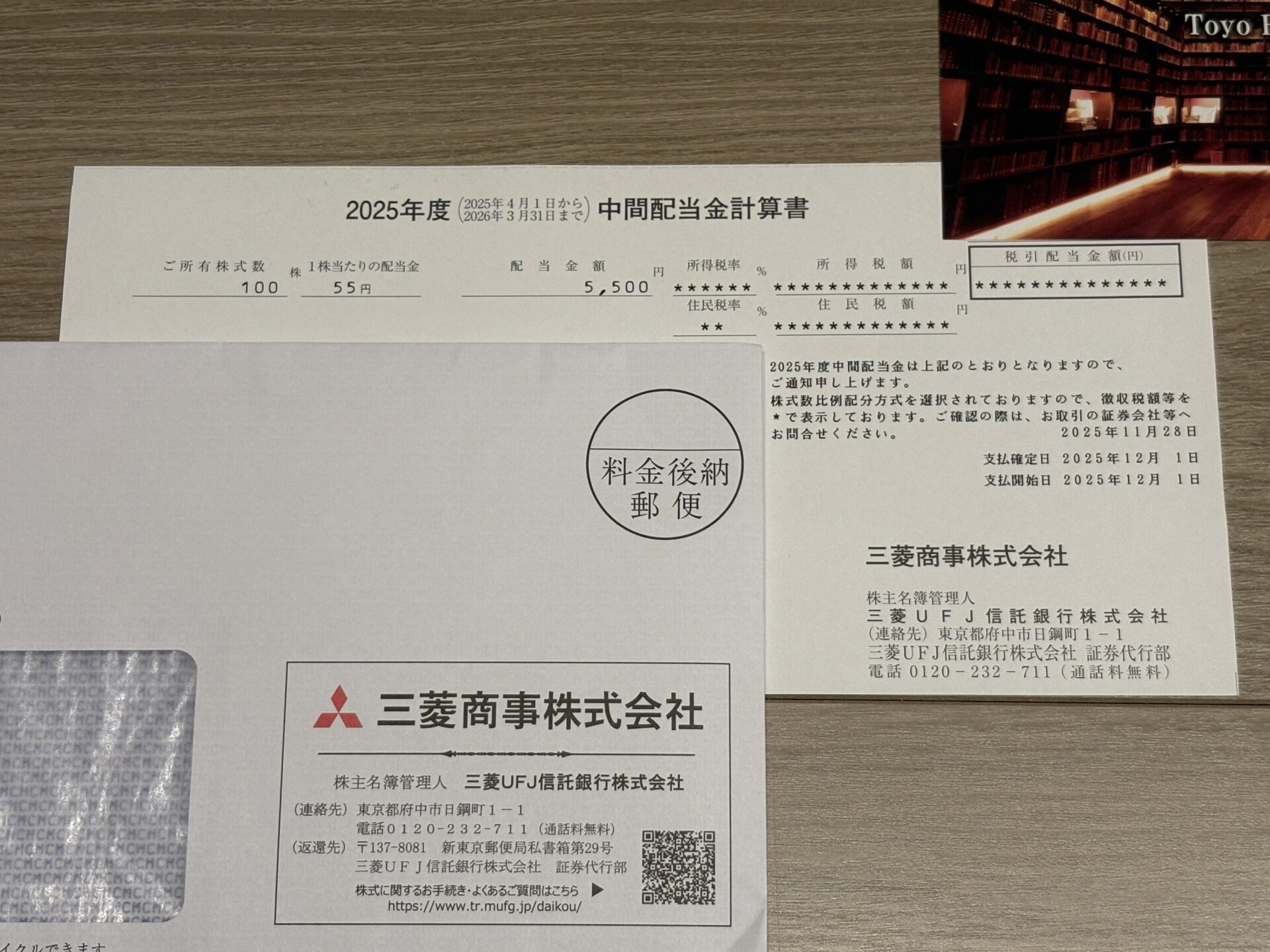 2025年12月1日に、三菱商事から配当金を頂きましたので、配当金について紹介します。