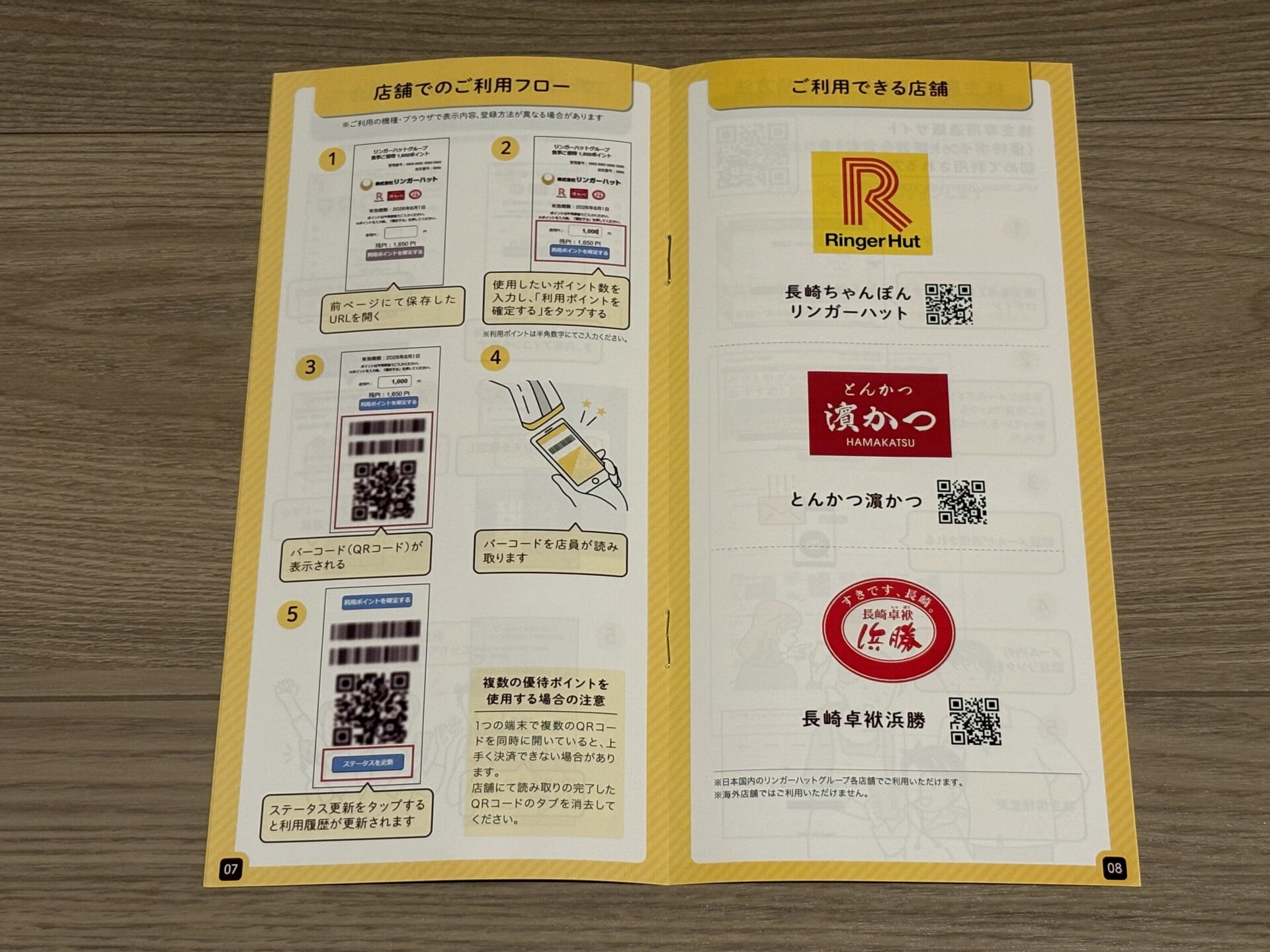 利用できる店舗は、リンガーハット、濱かつ、長崎卓袱浜勝です。
