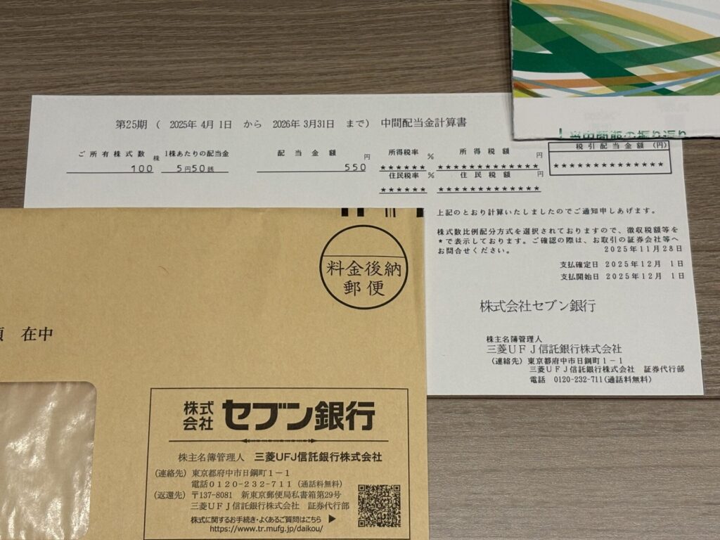2025年12月1日に、セブン銀行から配当金を頂きましたので、配当金について紹介します。