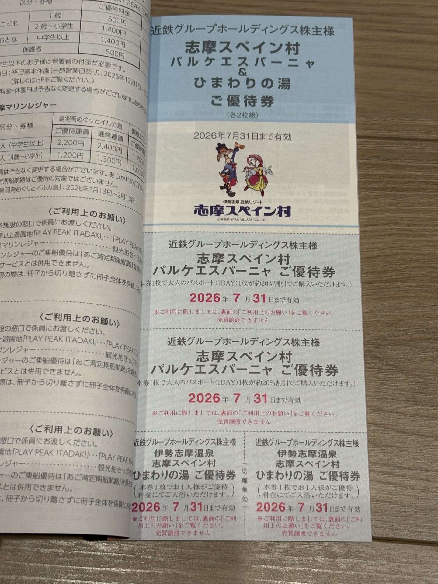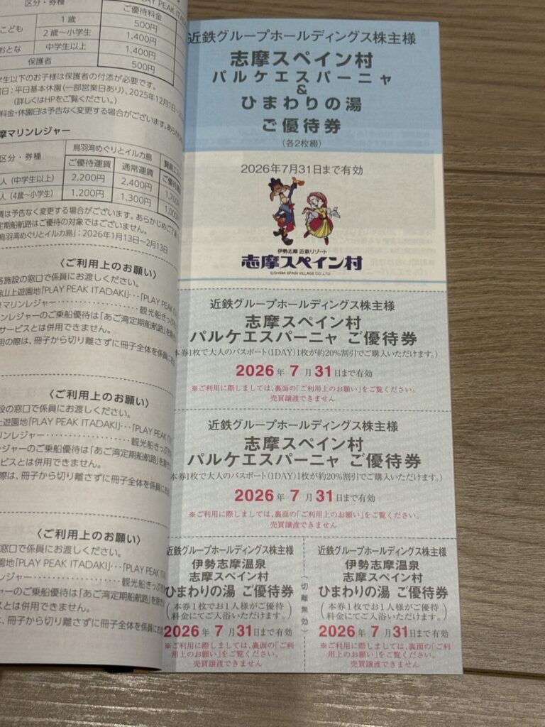 写真は、志摩スペイン村「パルケエスパーニャ」優待券と「ひまわりの湯」優待券が各々2枚です。