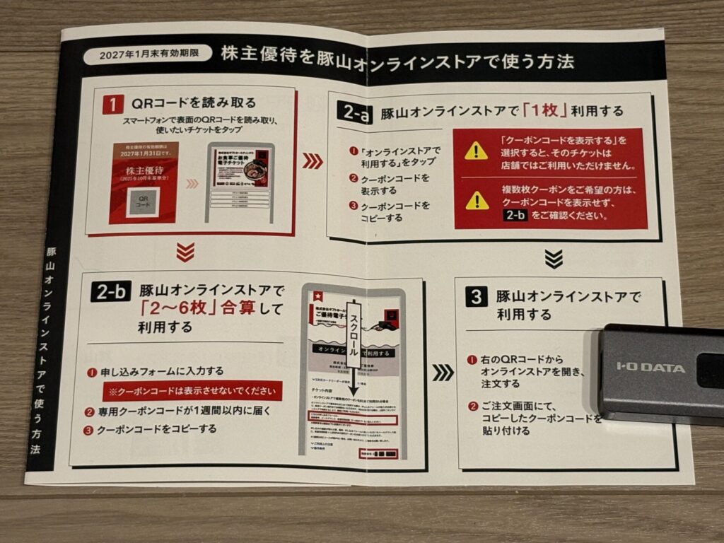 電子チケットはお知らせにあるQRコードを読み取って、店舗で利用するか、豚山オンラインストアで利用するかのどちらかを選択します。