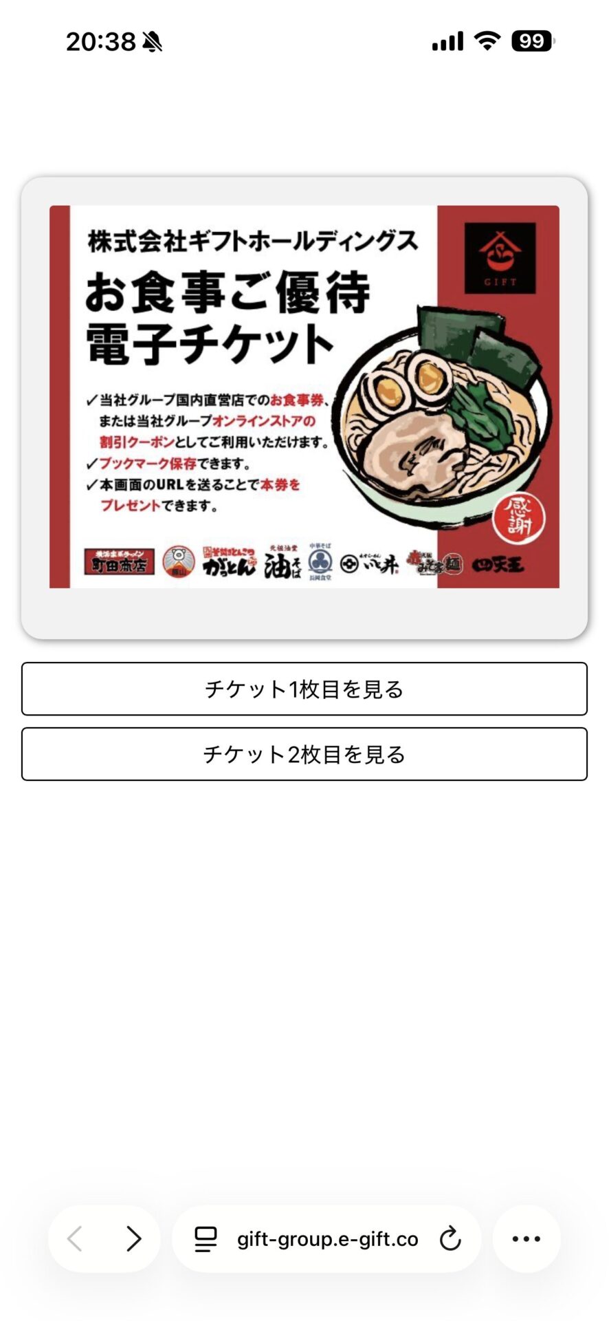 「株主優待」の下にあるQRコードを読み取ると、電子チケットが2枚発行されていることが確認できました。
