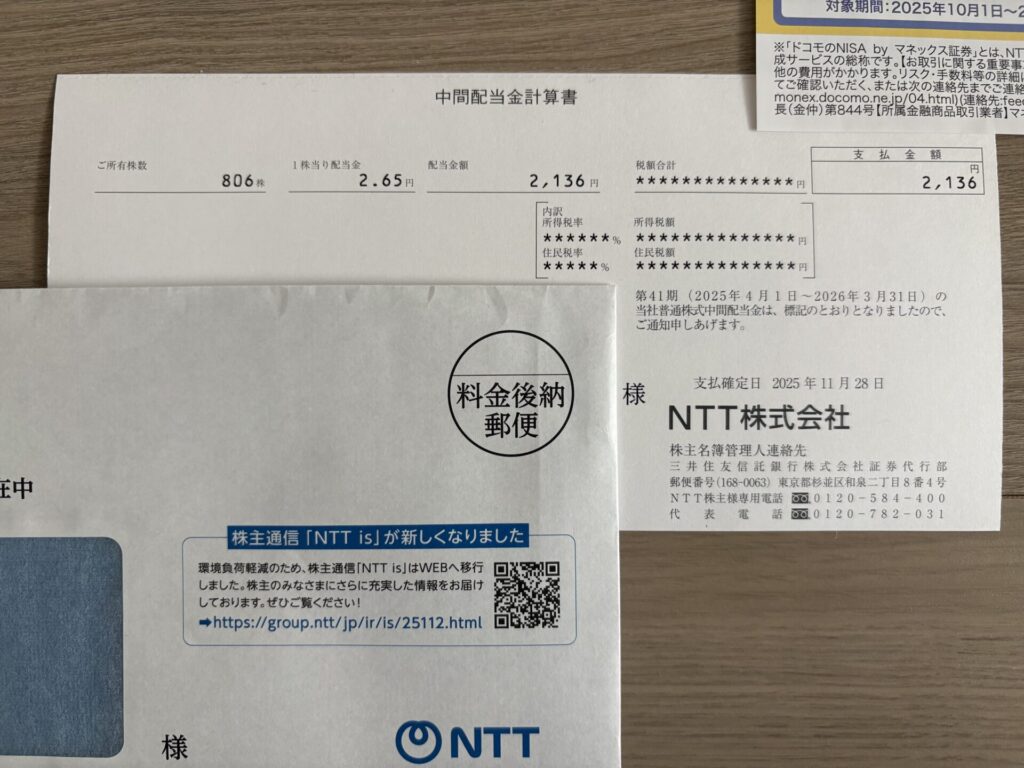 2025年11月28日に、NTTから配当金を頂きましたので、配当金について紹介します。