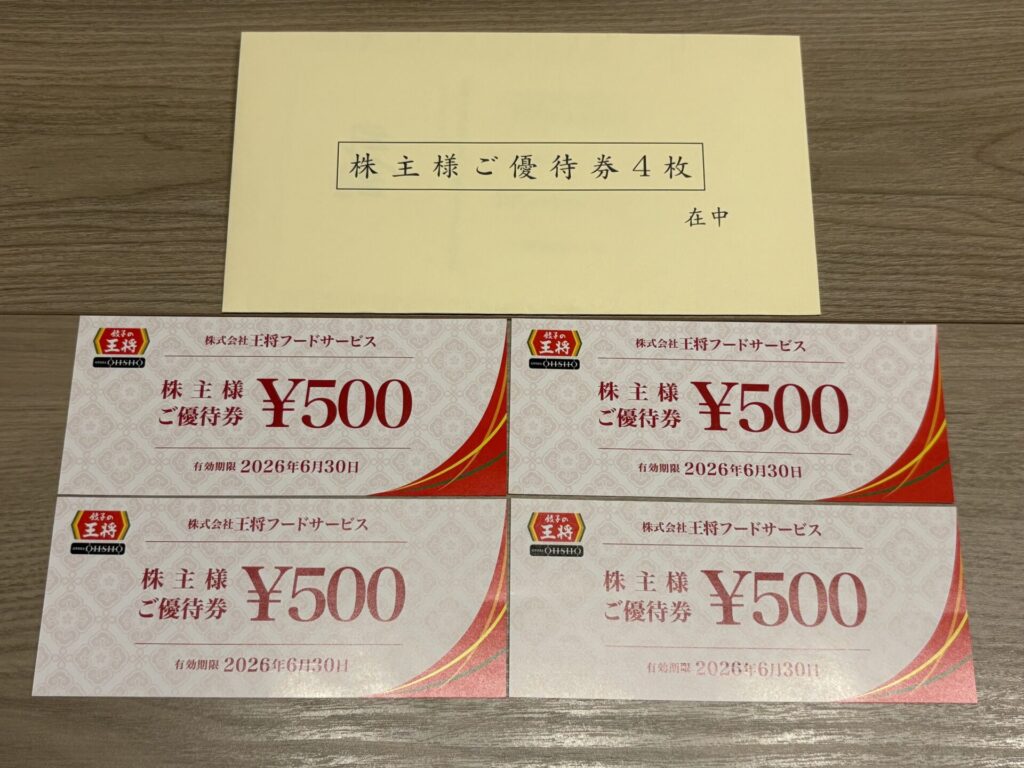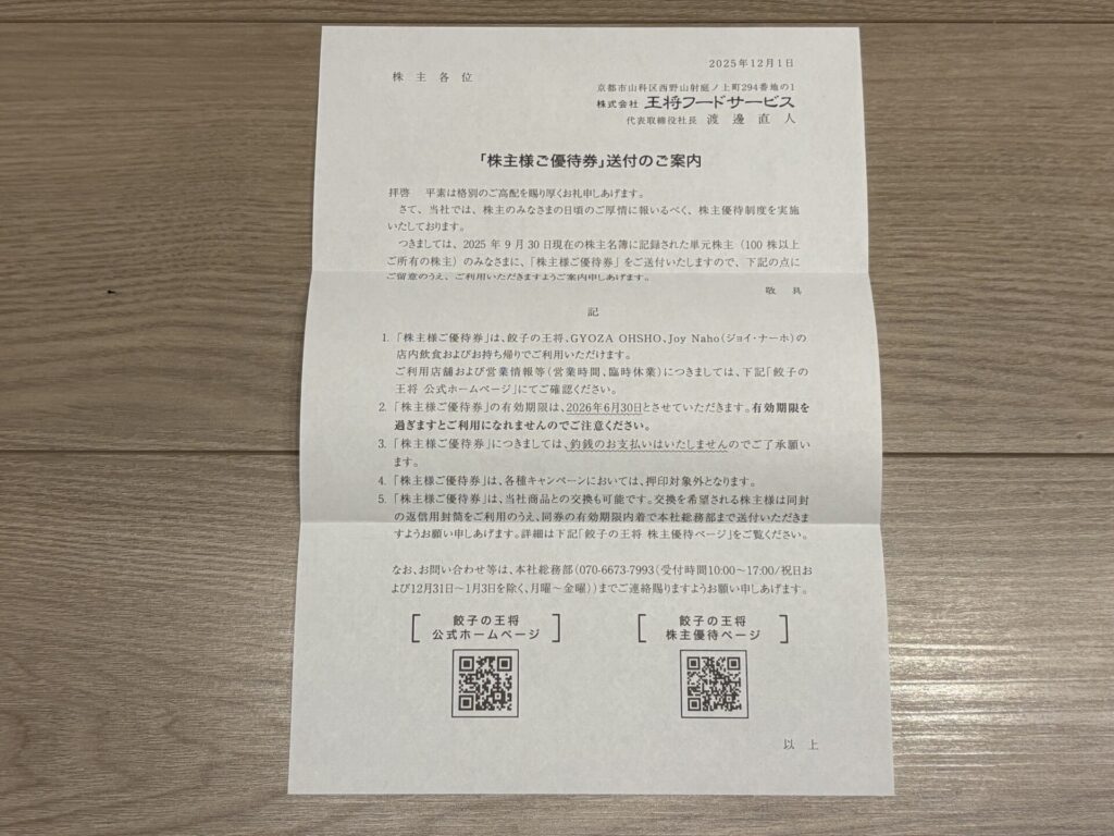 2025年12月3日に、王将フードサービスから株主優待が届きましたので、株主優待の内容を紹介します。